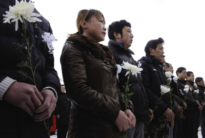 4日,人们在拉萨墨竹工卡县斯布村悼念遇难矿工。当日是清明节,西藏自治区在拉萨墨竹工卡县斯布村举行仪式,悼念3月29日山体滑坡中遇难的83名矿工。洁白的雪覆盖在整个山区,自治区领导、参加搜救的部队官兵、当地群众及部分遇难矿工的家属手持白花、哈达,依次敬献在专门为遇难矿工立的碑前,愿死者安息。