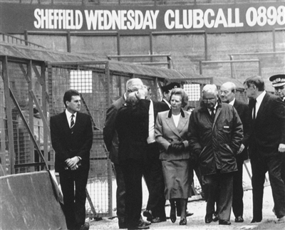 1989年4月16日,撒切尔夫人(中)视察谢菲尔德的希尔斯堡球场,前一天,那里发生了球迷踩踏事件。