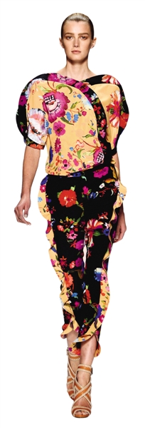 这身Etro圆润的肩部造型和对袖子独特的处理是其最成功的地方,而从上衣到裤子的荷叶边装饰则有一种画龙点睛的效果,过渡自然。作为能从快时尚品牌遍地开花的西班牙“杀出一条血路”的Etro,自然有其过人之处。爱旅游、爱自然,并且对花朵有着从一而终的热爱,让Etro有了鲜明的品牌性格。它所创造出的腰果花图案、佩斯利花卉满足了人们对花的艺术化想象,加上异域风格配色,让Etro能跳脱出“花”而成为“花外之花”,不用费尽心思搭配而本身就充满设计细节,被许多具有文艺气质、带有浪漫情怀的女性们所钟爱。