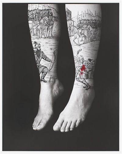 在《恶棍》部分,浴血沙场的骑士画面覆盖着被拍摄者的身体。图为2012年作品《神圣的反叛》。所有作品图片归西丽·娜沙特版权所有