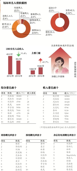 福布斯中国名人排行榜,由《福布斯》杂志中文版根据每年名人的收入、曝光率等数据综合而来。名人的选择范围涵盖娱乐、体育、文化和传媒等。其中收入包含了名人在影视作品、广告代言、商业演出、书籍出版等方面的税前收入,不扣除与经纪公司、主管单位分成部分,不计入名人个人的投资经营性收入。曝光率则由网络搜索、报纸、杂志和电视等单项组成。其中网络数据主要来源于百度的搜索量等,而平面媒体方面则考察了中国大陆、香港和台湾地区的38份报纸、54本杂志的新闻报道和封面数据。