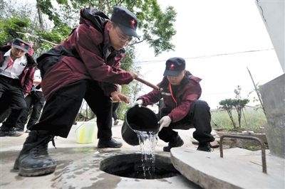 昨日,北京市传染病防控卫生应急队工作人员为芦山县金花社区的水井消毒。新华社记者 李文 摄