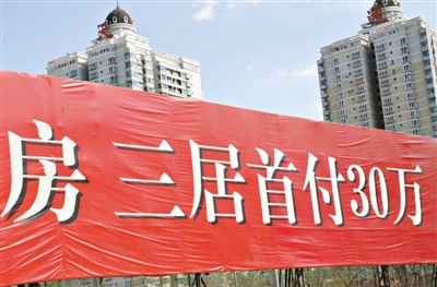 一般消费者在购房前主要在购房资格、贷款等方面产生疑问。图为4月6日,北京一楼盘外悬挂的促销招牌。图/CFP