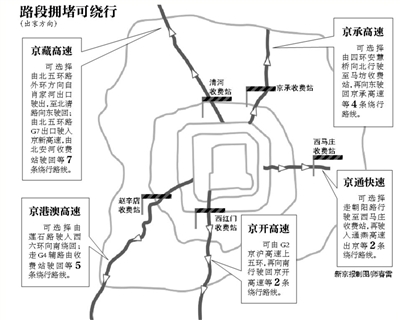 交通需求较大的高速公路预计有6条,包括京藏高速、京港澳高速、京承高速、京通快速、京开高速和机场高速,交通部门针对这些高速公路发布绕行方案。