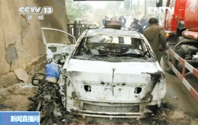 被暴力恐怖分子点燃烧毁的汽车。央视截图