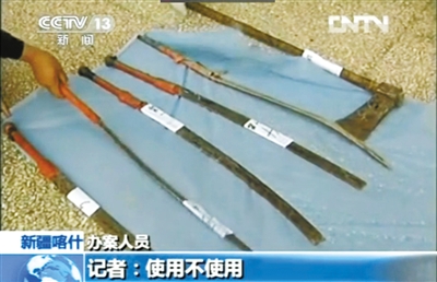 警方向记者展示暴力恐怖分子所使用的刀具。 央视截图