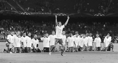 昨晨,拜仁客场击败巴萨,以7比0的疯狂战绩晋级欧冠决赛。他们的庆祝方式和前日闯进决赛的多特蒙德(下图)有些神似。德甲双雄进军决赛,德国足球再次扬眉吐气。