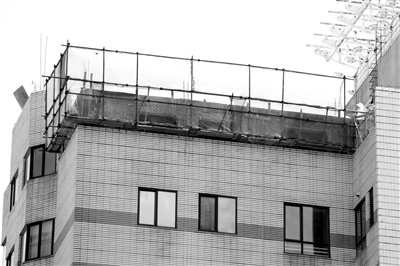 昨日中午,在该楼最高层的电梯口,堆放着一堆沙子、水泥等建筑用品。在顶楼,有座两层的建筑,第一层已经建好,第二层围墙已筑好约1米高。