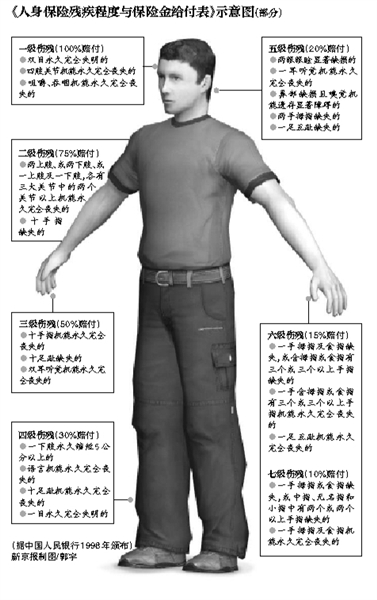 据悉,《比例表》是中国人民银行于1998年制定,保监会成立后发布《关于继续使用的通知》,明确各保险公司继续按《比例表》执行。《比例表》关于残疾等级、残疾程度分为7级34项。记者注意到,这些项目主要集中于肢体残疾。很多伤残索赔无据可依。