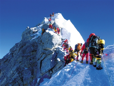 詹金斯和帕鲁若挤在人群中,等着前面100多名登山者缓慢前行。不远处岩石凸起的危险地带,有20多个登山者依赖同一根破旧的绳索向上攀爬。一根埋入冰里、严重弯曲的雪桩是固定这根绳索的唯一工具。(据新华社)