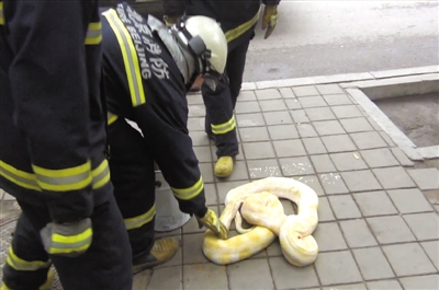 消防人员准备将黄金蟒放入铁桶内。昨日下午1时20分,朝阳区十里河桥附近的辅路边,出现一条长约两米的黄金蟒。接到报警的华威消防中队的消防人员赶到现场,将黄金蟒引入个铁桶内、带离。