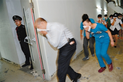昨天下午,中钢大厦发生“火灾”,位于高层的员工们用湿毛巾捂住口鼻,低头跑入步行楼梯,下到位于15层的避难层。记者看到,沿着楼梯向下,有“避难层”等字样的指示牌和箭头,引导员工前往避难层。