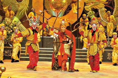 李阳鸣(左)、六小龄童、董文华(右,著名京剧表演艺术家)在2004年春节戏曲晚会上表演。 供图/六小龄童