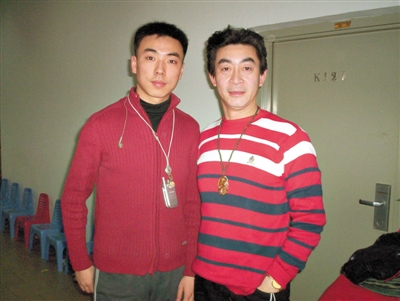 李阳鸣(左)与六小龄童在2004年演出后台合影。