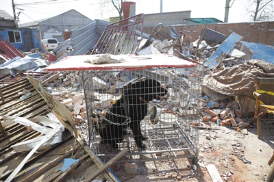2010年4月10日,丰台区万泉寺村,一家汽修厂的废墟中,工作人员饲养的一只藏獒被关在笼子里。新京报记者 王嘉宁 摄