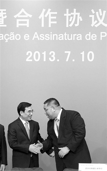昨日,澳门旅游塔,第二届京澳洽谈会上,北京市市长王安顺和澳门特区行政长官崔世安一起见证京澳合作协议签约仪式。 本版摄影/新京报记者 薛珺 摄
