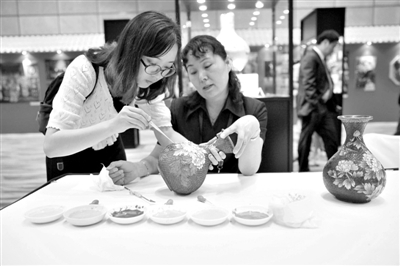 昨日,“魅力北京”图片展,一位女孩在体验景泰蓝制作工艺。