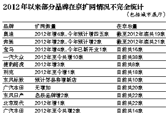 尽管北京实施限牌政策,且近两年新车销售进入平稳发展期,仍挡不住部门品牌在京扩网之势。扩网一方面是基于厂家的布局策略,另一方面也是销量上佳给投资者和厂家带来了信心。上周,记者走访了北京部分品牌经销商,对这些品牌的在京扩网情况进行了粗略统计。