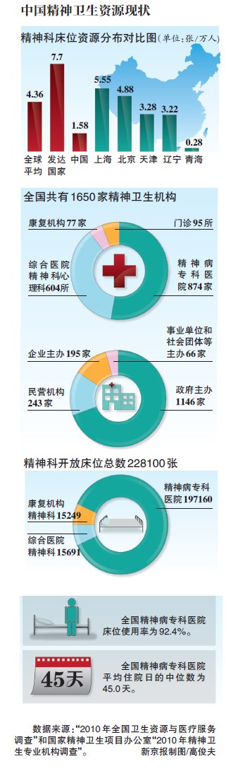 全国的比例更为悬殊。2012年数据显示,中国已有1亿多名各类精神障碍患者,重症约1600万人,精神科床位数是每万人1.58张。