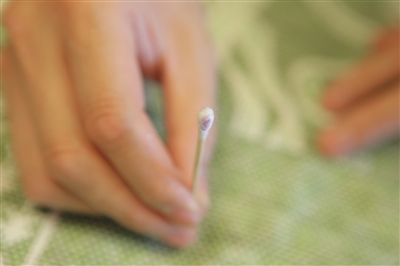 实验过程:董金狮介绍,标准要求,要用浸透乙醇的脱脂纱布在染色部位用力来回擦拭10次,目测观察纱布上是否有颜色。此次实验也参照该方法,同时由于人睡在凉席上难免会排汗,而汗中有油脂,因此模拟这个情况,用棉签分别蘸取酒精和食用油,在凉席染色部位各擦拭10次,再逐一观察。
