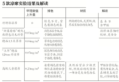 实验结果:竹纤维凉席被测出基本不含甲醛,而高级儿童藤席甲醛数值上升量最高。(详见表格)