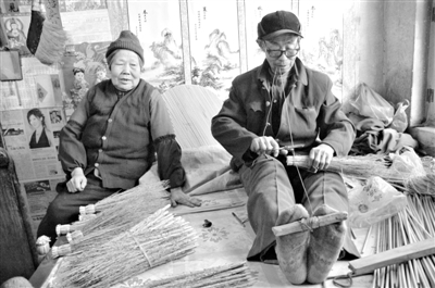 两位老人在利用传统工艺制作扫帚。