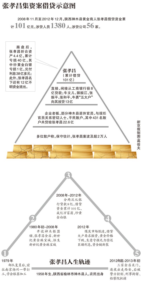 2012年底,张孝昌资金链断裂。这名靠民间集资炒作黄金白银的神木大户,其拥有的“黄金帝国”于一夜间倾塌,引发众多债主恐慌。