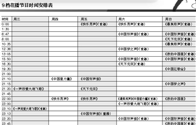 周三只有一档节目《一声所爱》,而周四出现了《中国星力量》《快乐男声》,可以从21:10收看前者,90分钟之后转台看后者,“快男”首播完成后立刻重播,补上开头就可以了。周五观众最为为难,《中国好声音》为了压住“快男”,在22点整“快男”播出时间曾经连续50分钟不进广告,并在23点即节目快结束时,连补3至4段广告。如果您为了少看广告,可以在22点档“好声音”插播第一条广告后,只看“快男”,此时“好声音”也临近尾声,后面内容可于当天深夜在浙江卫视看重播。