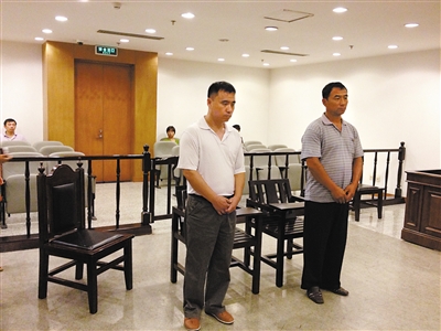 田长利与曾担任村主任的弟弟田长满(左)因涉嫌非法转让土地使用权一同受审。新京报记者 张媛 摄