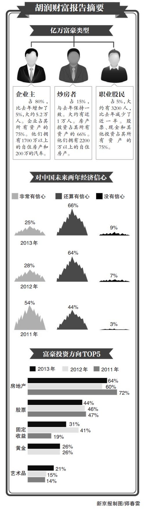 新京报讯 (记者张轶骁)胡润研究院与群邑智库昨日联合发布《2013胡润财富报告》,报告显示,截至2012年底,全国有105万千万富豪和6.45万亿万富豪,分别比去年增长3%和2%,增速创下5年来的新低。在千万富豪中,分别有15%的炒房者和15%的职业股民,共占千万富豪人数的三成。