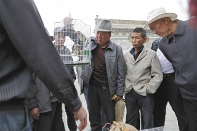 清晨,丹噶尔古城内,城楼下的花鸟市场。