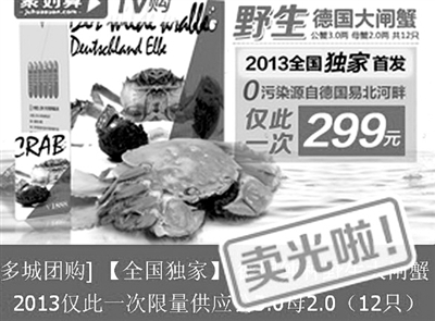 近日,淘宝聚划算推出了德国大闸蟹的团购,分别推出199元、299元和399元三种规格。此货品一经推出,立刻遭遇疯抢,目前这些蟹券的页面上已经显示“卖光啦”,据统计已卖出30万只左右“德国大闸蟹”。