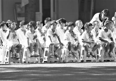 昨日上午9时,东城区定安里小学操场边,五六年级学生正在带刚入校的一年级小同学“排队”。在老师指导下,“小豆包”们的开学第一课就在同学间的友爱中拉开序幕——两人一组,每位大同学拉着一位小同学走进开学典礼的现场。