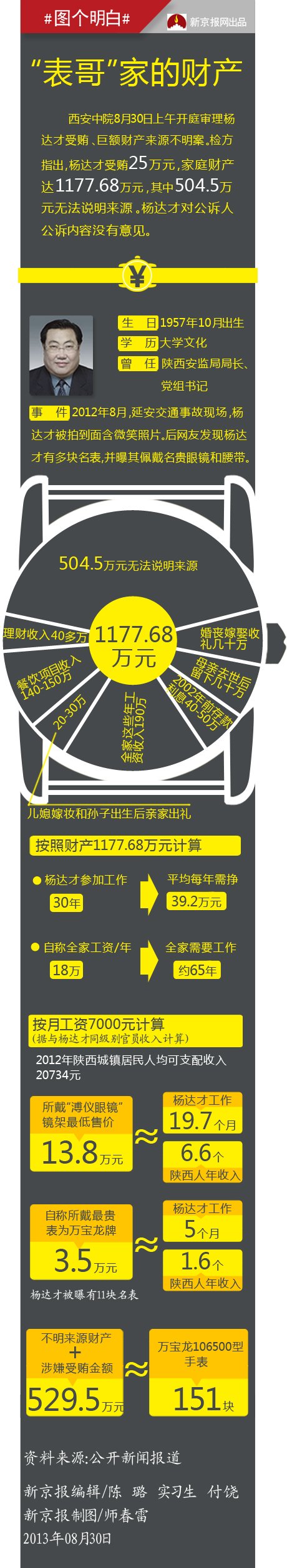 公诉人说杨达才家财产达1177.68万元。这笔钱,如果和其他官员贪腐案件所涉金额相比,并不算多。但是,杨达才参加工作大概30年,照此计算,他每年需要挣39.2万元,他们全家一起,得工作65年。