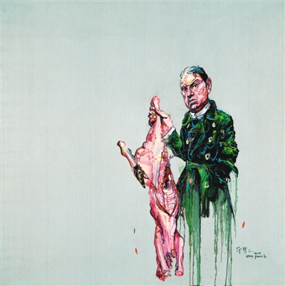 2008年所作《培根和肉》是《面具之后/肖像》系列作品之一,曾梵志刻意淡化、删减肖像的整个造型,人体躯干有大面积的残缺不全,局部的边线也模糊不清。