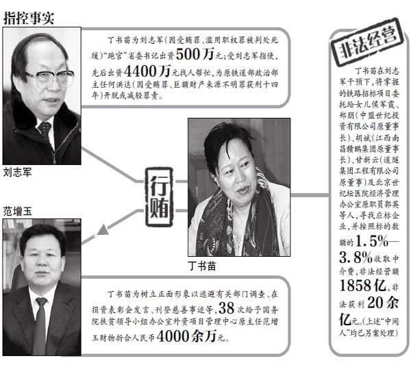 丁书苗为刘志军(因受贿罪、滥用职权罪被判处死缓)“跑官”省委书记出资500万元;受刘志军指使,先后出资4400万元找人帮忙,为原铁道部政治部主任何洪达(因受贿罪、巨额财产来源不明罪获刑十四年)开脱或减轻罪责。