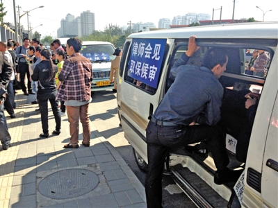 昨日10点半,朝阳区看守所门前已有20多人在排下午的队。大门外,停着8辆挂有“律师会见”字样的车,还有不少人在发放律师名片。