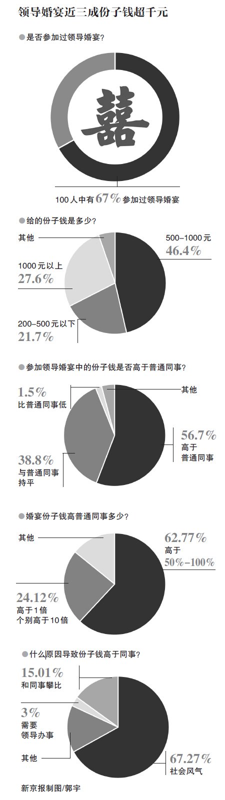 新京报记者对来自北京、上海、河南等全国100名不同职业人员的调查中,100人中有67人参加过领导婚礼。56.7%的人送的份子钱要高于普通同事。