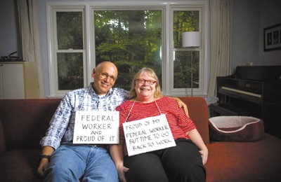杰夫·盖茨和妻子苏西一起接受媒体的采访。杰夫胸前挂着的牌子写有:“(我是)联邦雇员,为此而骄傲”。苏西胸前挂着的牌子写有:“为我家的联邦雇员感到骄傲。不过,该是复工的时候了。”