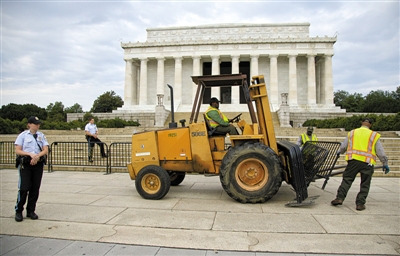 10月1日,当位于华盛顿的林肯纪念堂因联邦政府“关门”而停止运营时,工作人员在通往该纪念堂的路上设置路障。