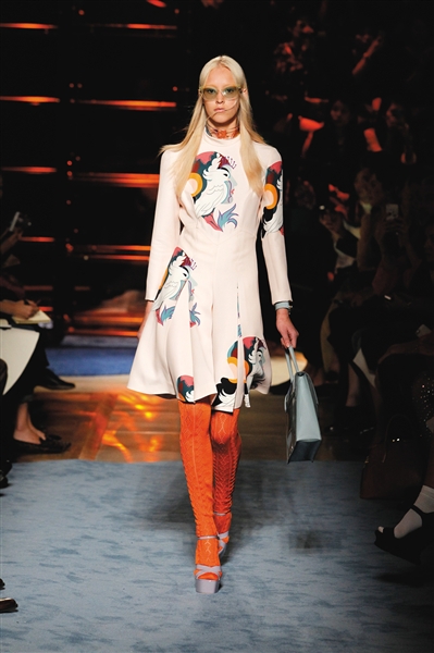 六十年代的外套、八十年代的泡泡裙、色块拼接、材质混搭……这就是新一季设计师Miuccia Prada重新组合后,展现的新一季Miu Miu女孩优雅与活力并存的面貌,而玛丽珍鞋与羊毛袜在各种造型搭配中的频频亮相,更是让人印象深刻。10月2日下午,Miu Miu在巴黎耶纳宫(Palais d'Iena)举行了2014年春夏时装秀,发布了45个充满了复古与趣味的新一季造型。