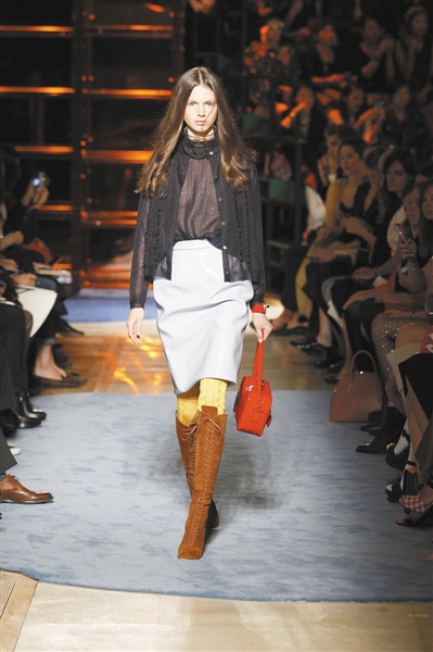 最爱Look右:“以轻薄的透视上衣搭配PVC半裙,加上麂皮长靴,是个有新意的搭配的手法,也很性感。”