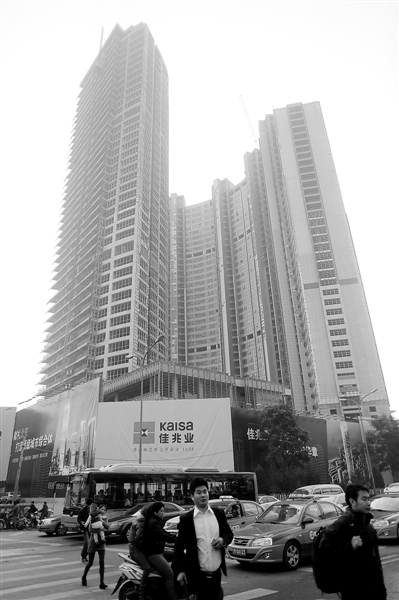 10月16日,记者来到位于东长安街、地铁大望路站之上的长安八号项目,看到项目北楼、南楼都已封顶,但还没进行外立面装修,周边来往人群早已习惯这个烂尾楼,唯一的变化是项目新换上“佳兆业”标志的围挡。