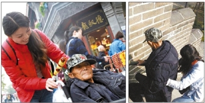 在北京的3天时间内,胡雪莹推着肺癌晚期的老父亲逛前门(左图),爬八达岭长城(右图),完成父亲的心愿。网友供图