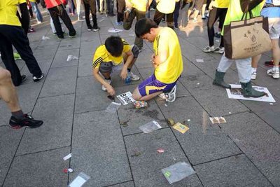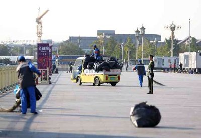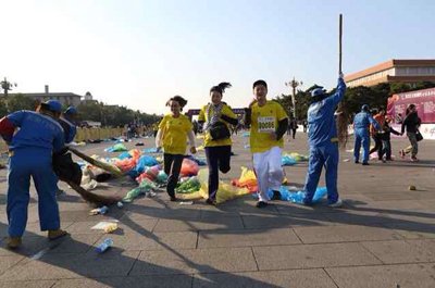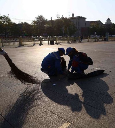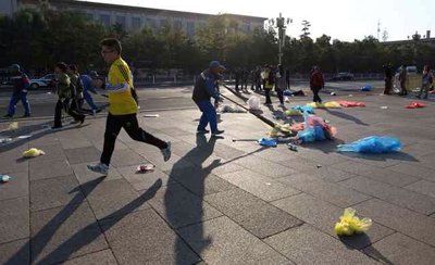 2013北京马拉松今天上午鸣枪开赛。开幕式后,天安门广场留下不少垃圾。动用四辆垃圾清运车,约30个清洁工,用时15分钟清理干净。新京报记者 韩萌 摄影报道