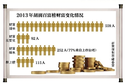 胡润百富榜上,新上榜的115位富豪中,只有4位来自于新的上市公司。而财富缩水的252位富豪中,77%来自于上市公司。
