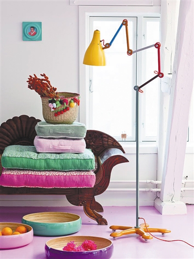 粉色的地面营造出整个空间的柔美质感,各种花样色彩的坐垫靠枕给人温暖的感觉。草编小筐里鲜艳的干花,让整个房间闲适而甜美。