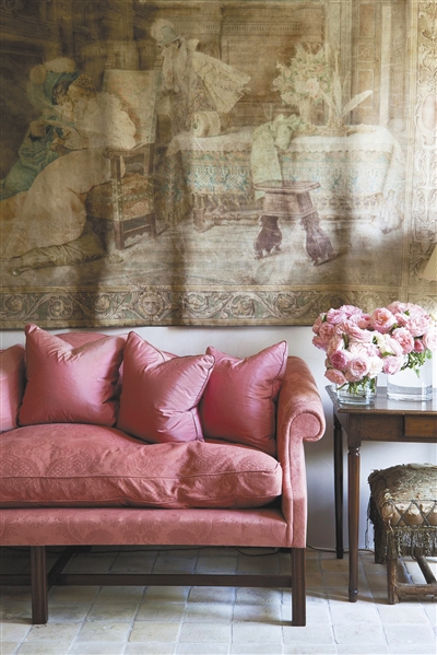 盛开花朵般粉红的颜色布满整个沙发,这是成熟果实的深粉红色调。还有挂毯上如田野间的泥土般色彩,搭配欲滴的鲜花,干净的青石色地面如同初秋的天空般辽阔高远,勾勒出入秋后家中的花香和美好。