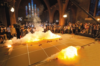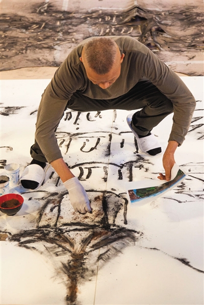 2 进而把不同的火药按照创作要求布撒在刻版和麻纸之上。此时,火药在蔡国强那儿就是画笔和颜色,他以火药画出各种场景。