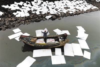 昨日,工作人员将白色吸油毡放入海中进行油污处置。青岛黄岛地区发生原油泄漏并引发事故,部分原油沿着雨水管线进入胶州湾,海面过油面积约3000平方米。图/CFP